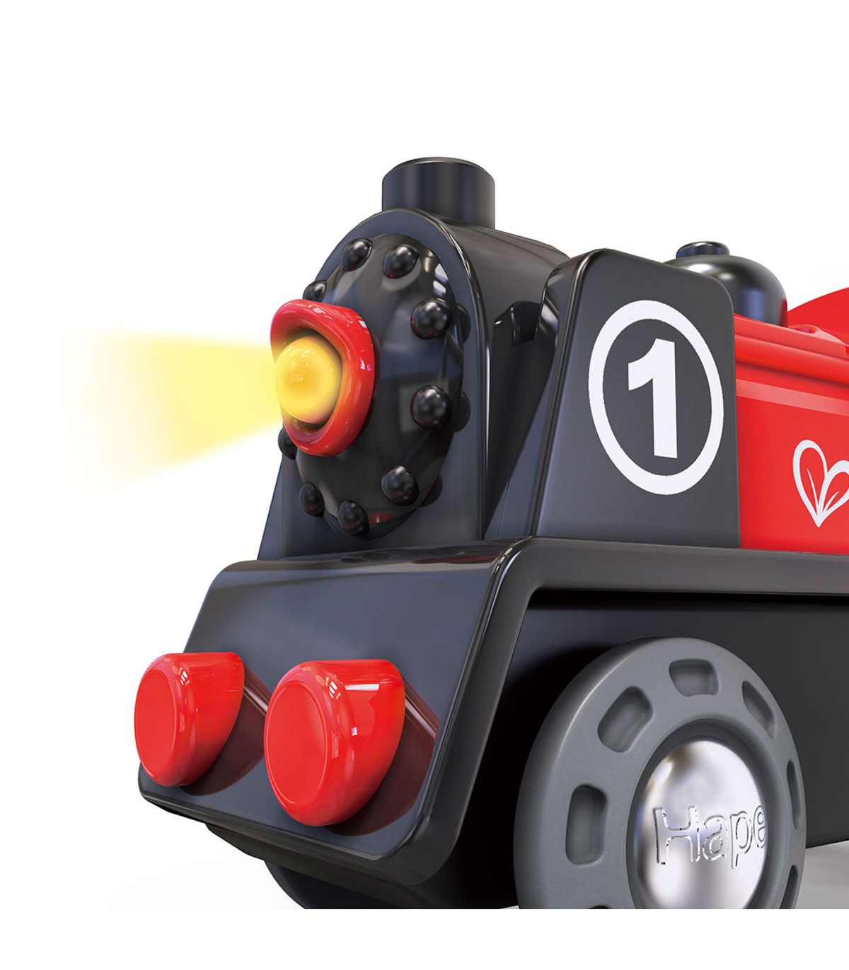 Esta pequeña locomotora se desplaza con un farol que ilumina el camino. El toque de un botón pone a esta pequeña locomotora marcha atrás.