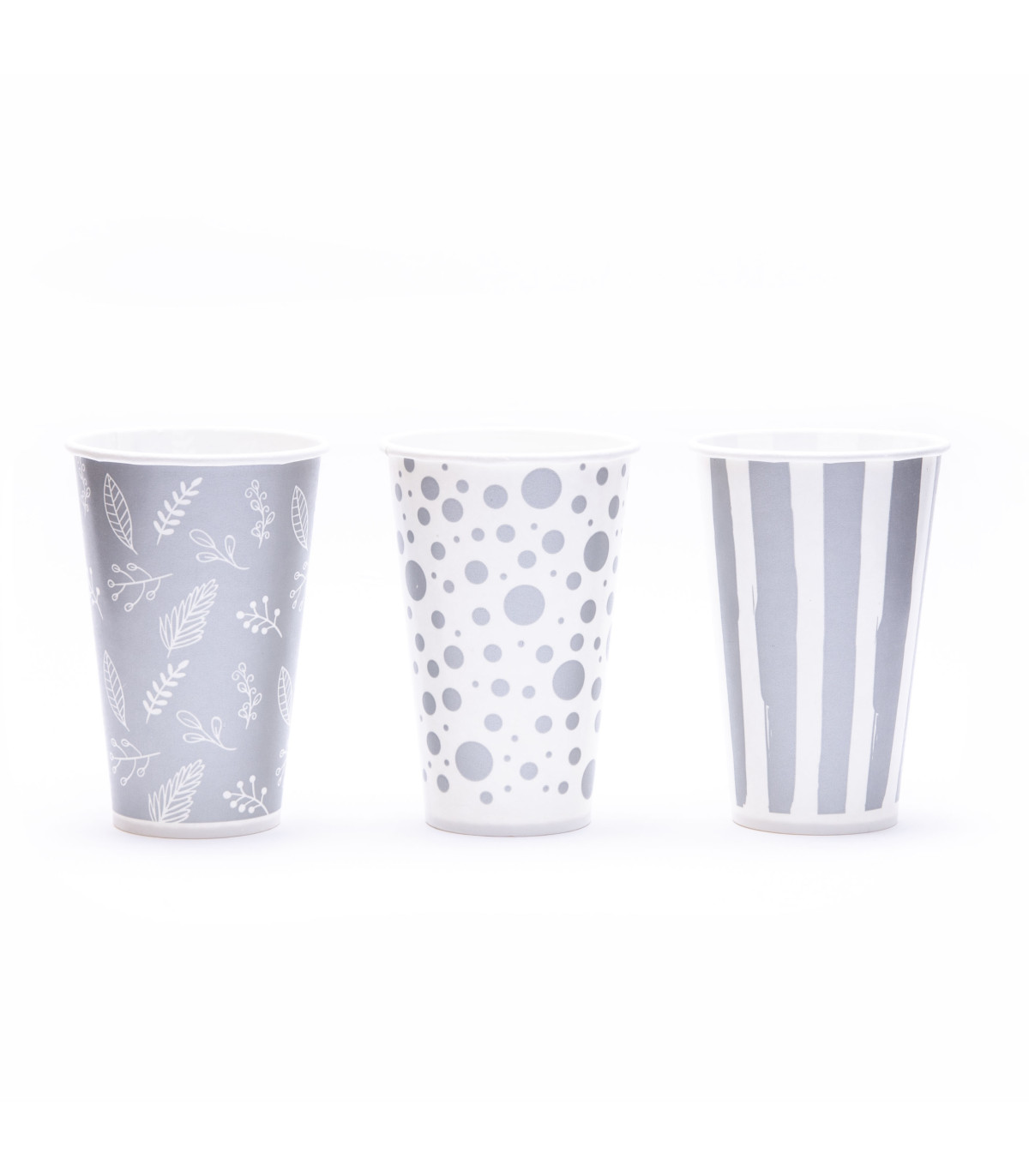 8 portavasos de cartón de 10 cm de diámetro impresos a cuatro colores. Estampado de hojas de un lado, rayas del otro.