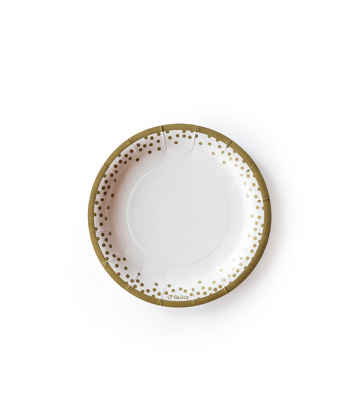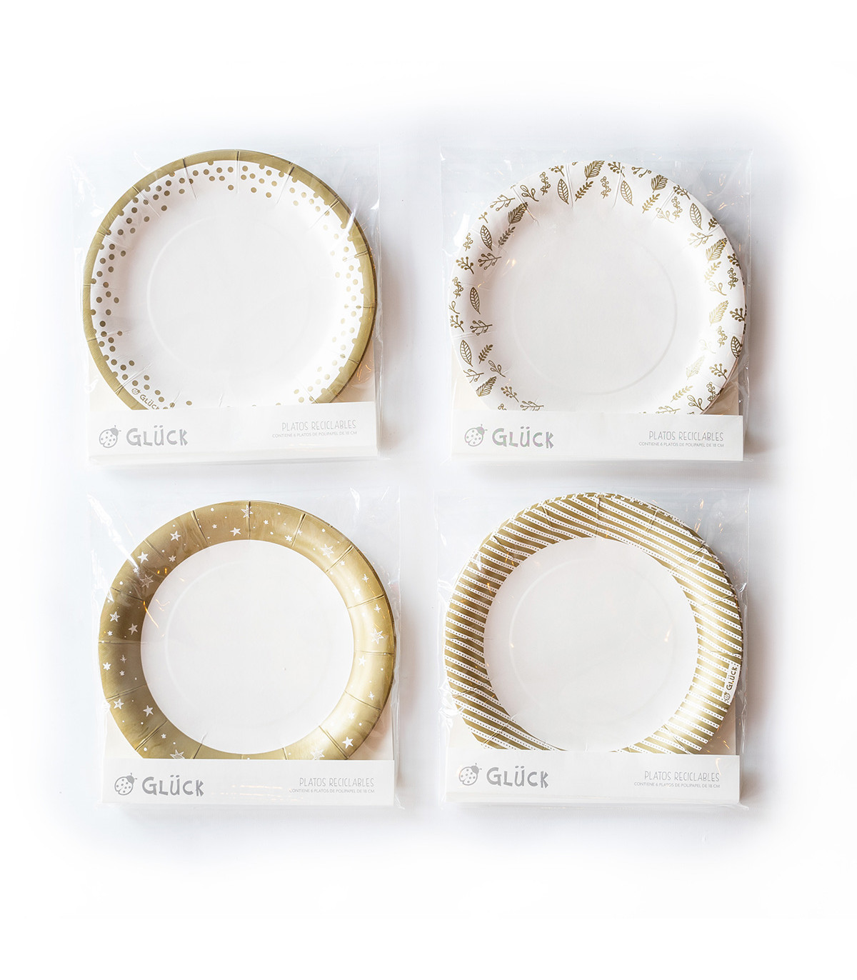 8 platos de cartón de 18 cm de diámetro con stamping dorado para decorar la mesa. Descartables y biodegradables.