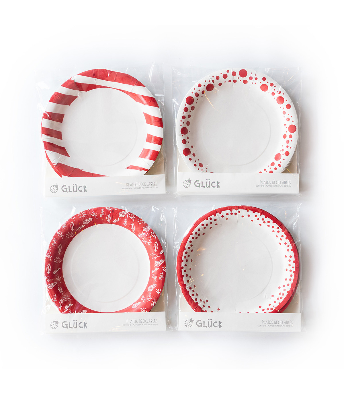 Set de 12 paquetes de 8 platos de 18 cm de diámetro de polipapel con motivos navideños de la colección Navidad Clásica de Glück, para decorar la mesa en Navidad. Contiene 6 paquetes de platos de tiras rojas y blancas...