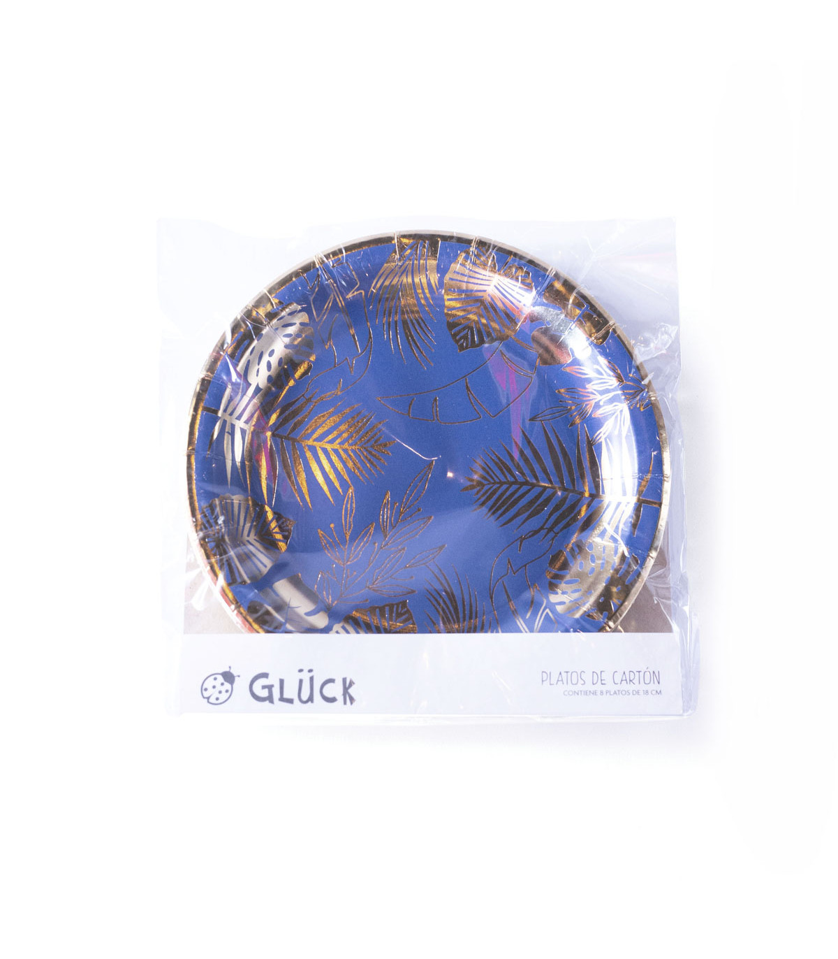 8 platos de cartón de 18 cm de diámetro con stamping dorado para decorar la mesa. Descartables y biodegradables.