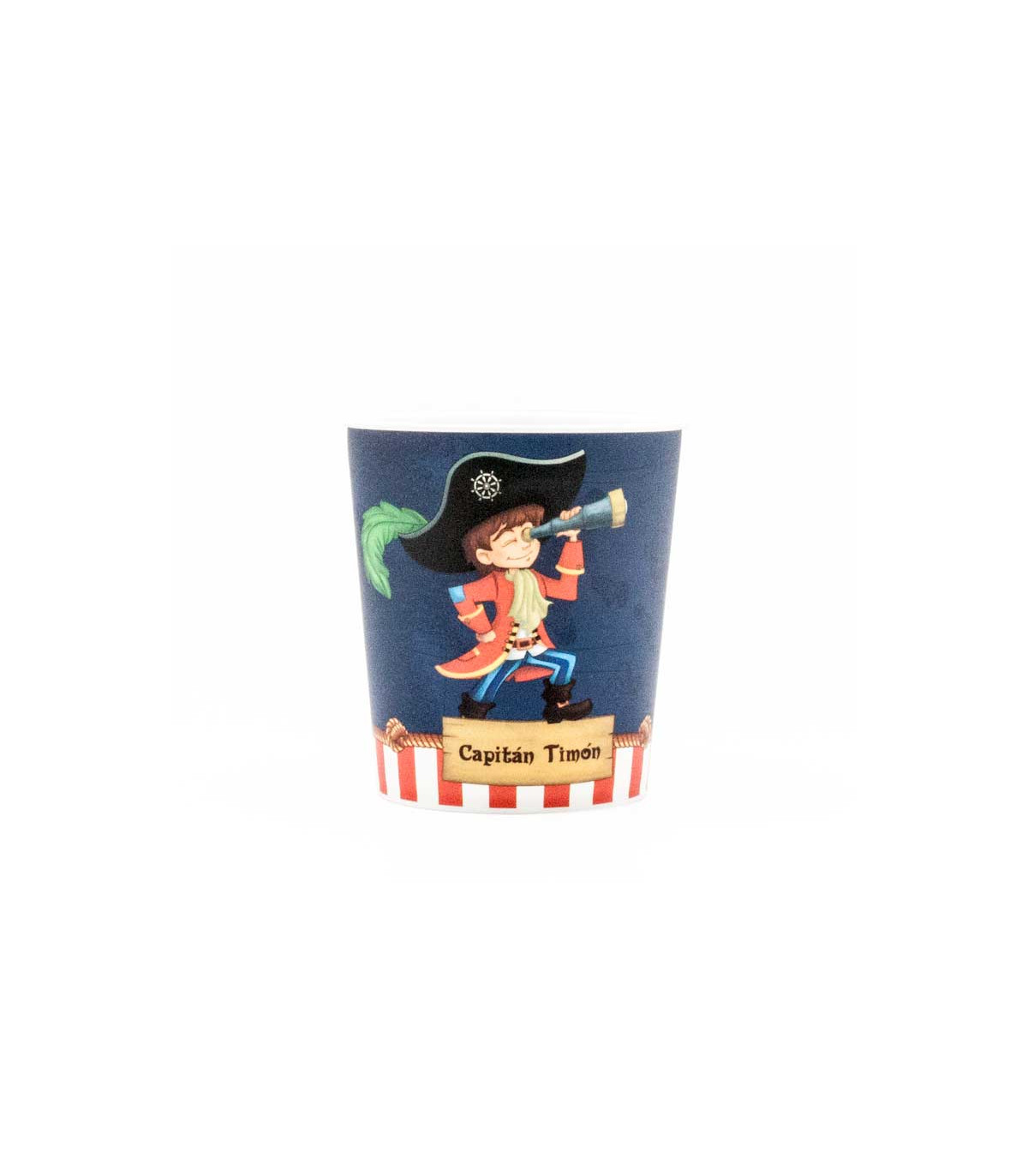 Un vaso plástico de 350 cm3 con motivo del pirata Capitán Timón para decorar en fiestas.