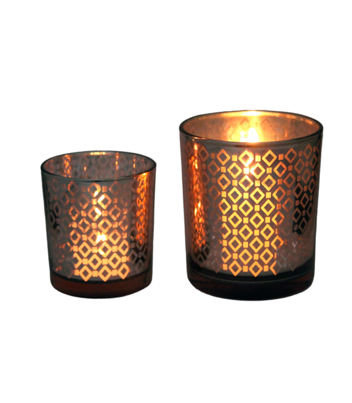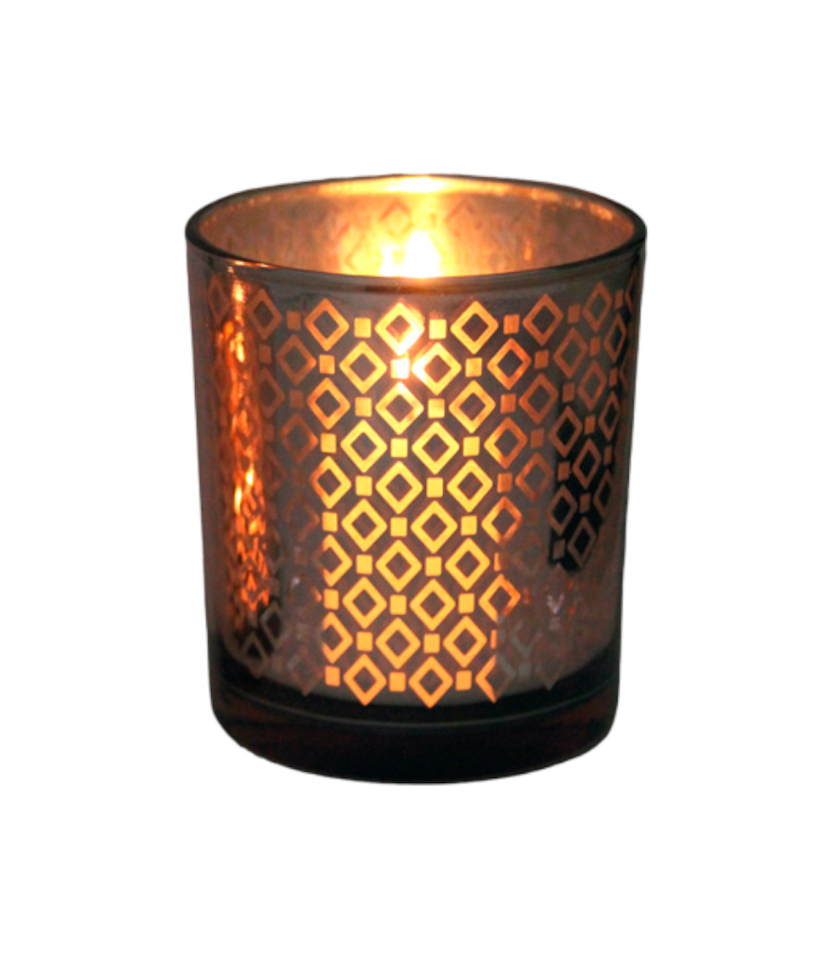 Un fanal de vidrio facetado de 11 cm de ancho y 11 cm de alto. No incluye vela.
