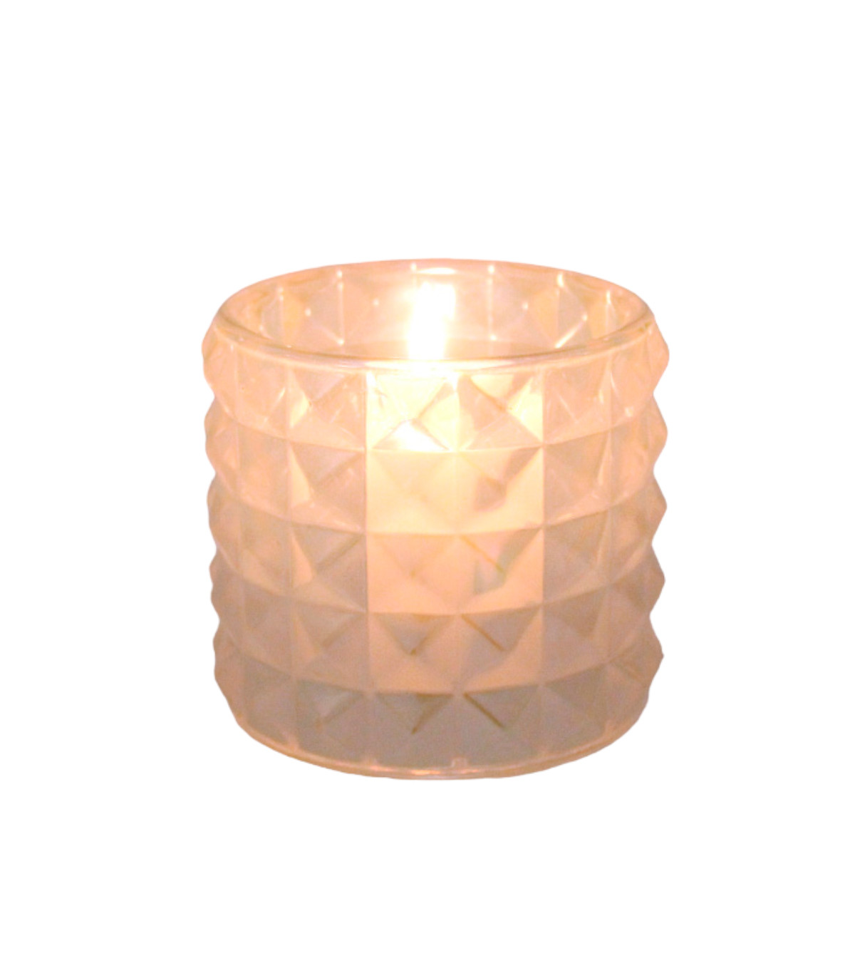 Un fanal de vidrio facetado de 11 cm de ancho y 11 cm de alto. No incluye vela.