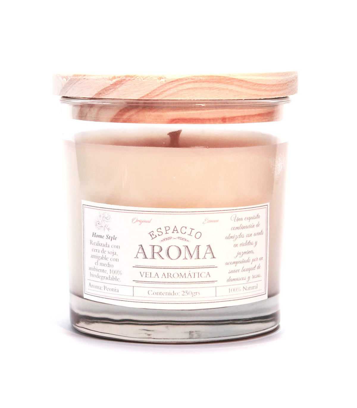 Una vela aromática de soja en envase de vidrio con uno de los aromas favoritos de Espacio Aroma. El pabilo de algodón garantiza una combustión limpia y uniforme.